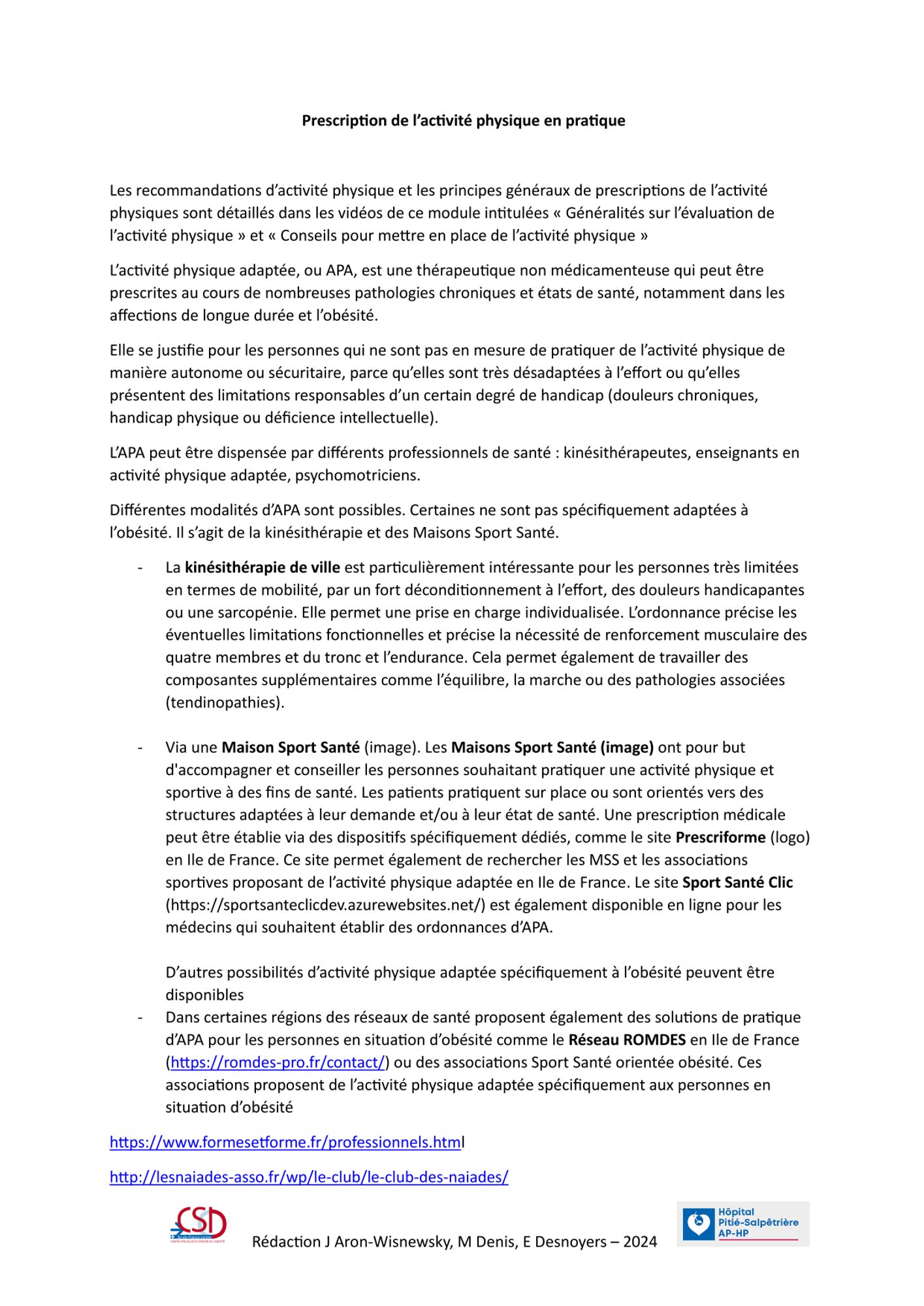 Ce module est dédié à l’évaluation de la pratique l’activité physique adaptée (APA) et aux conseils personnalisés à proposer.