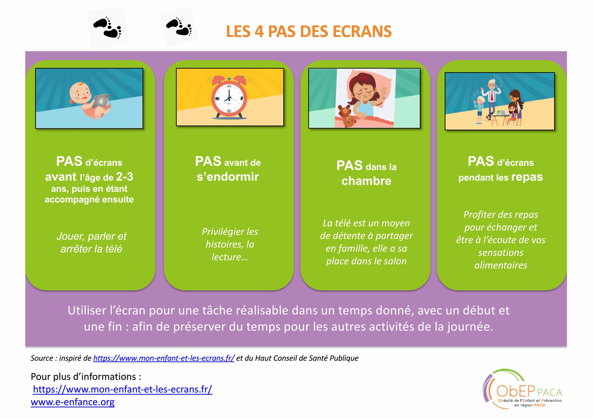Chez l’enfant, de simples règles de vie en famille, issues des travaux de la Société française de pédiatrie, peuvent être appliquées :