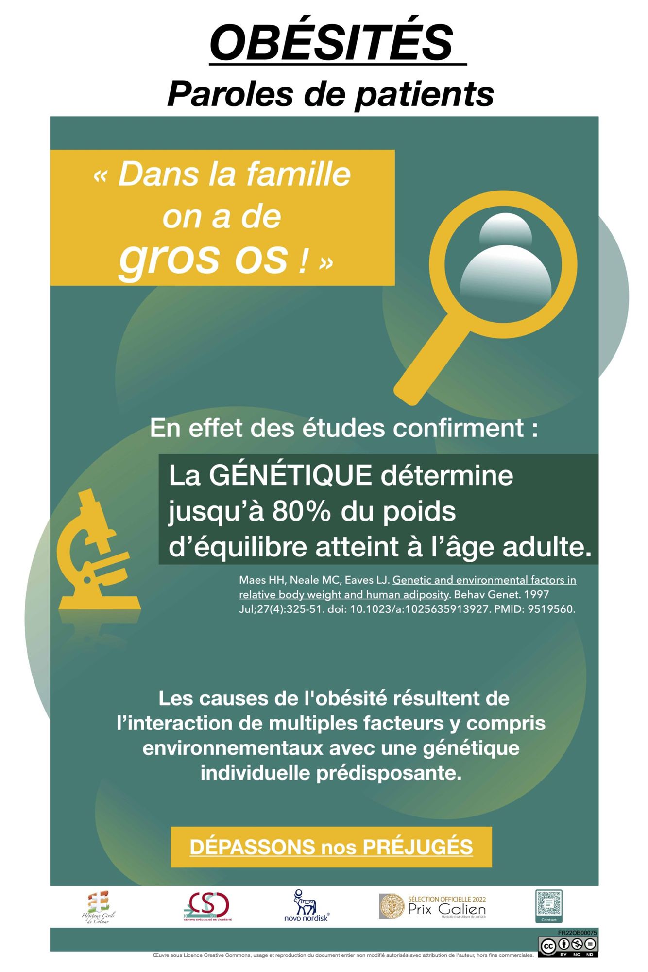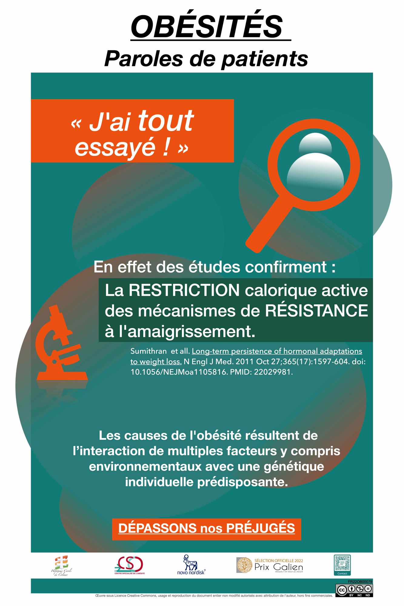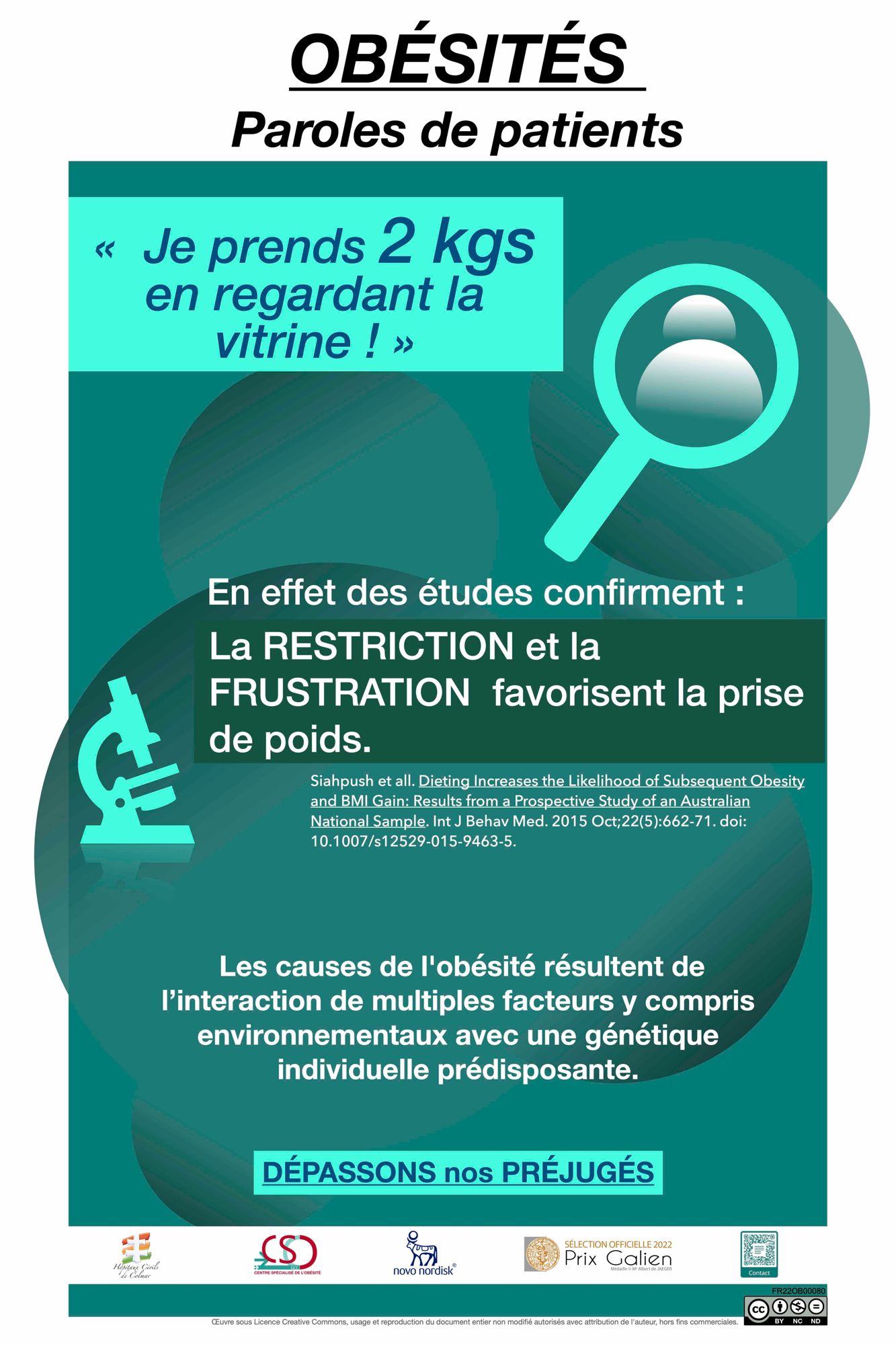Il paraissait logique de rétablir la réalité, et valoriser la parole des personnes en situation d’obésité, en soulignant la vérité scientifique de leurs propos, illustrée par des publications internationales de l’Evidence Based Medicine. De la sorte, les mécanismes de régulation du poids et de la prise alimentaire sont explicités, permettant au public des affiches de comprendre que la réalité est plus complexe qu’on ne le pense, et le poids beaucoup moins dépendant de la volonté. Les préjugés tombent.