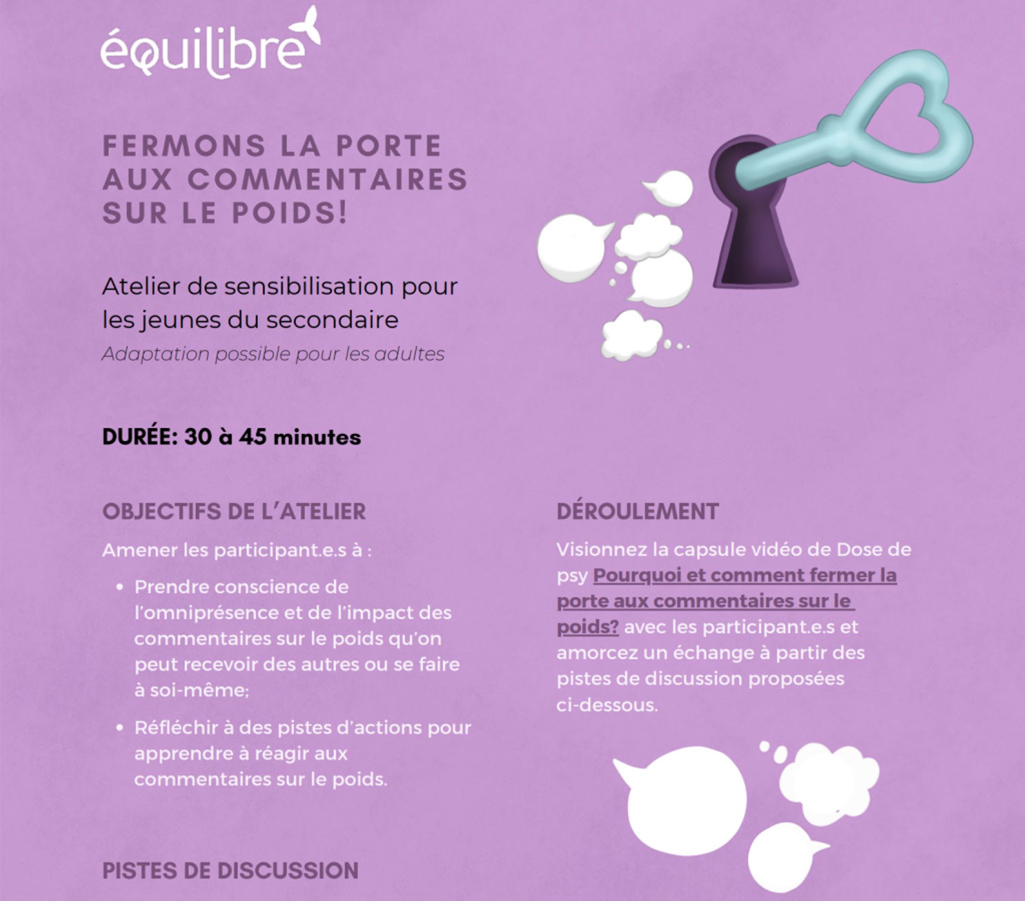 Un premier outil de sensibilisation propose des conseils et pistes de réflexion pour tou.te.s, à télécharger : Comment réagir aux commentaires en lien avec le poids et l’apparence, qu’ils proviennent des autres ou de soi-même?